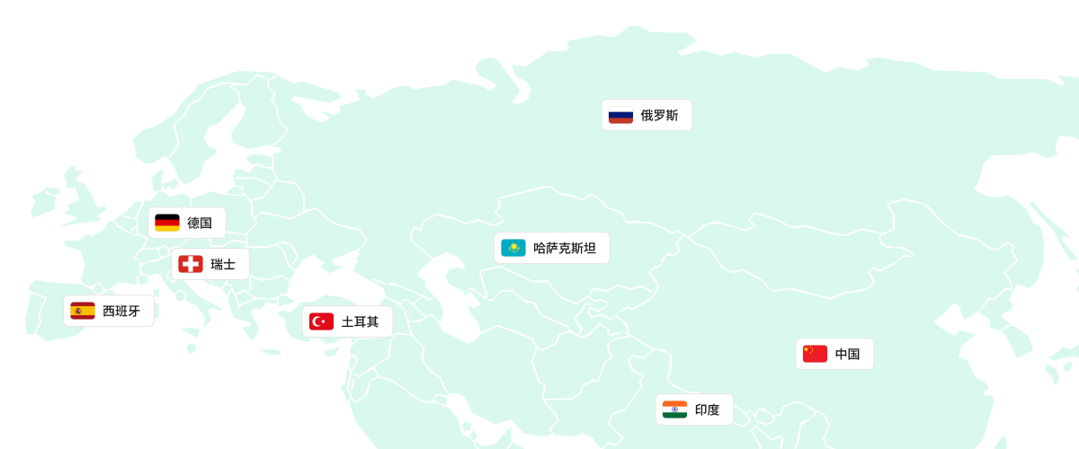 俄罗斯 德国 哈萨克斯坦 瑞士 西班牙 土耳其 中国 印度